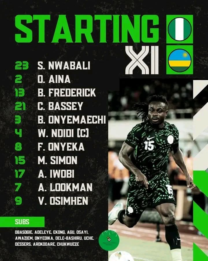 kipe ya Super Eagles ya Nigeria yatangiranye abakinnyi bakomeye. Mu izamu hari Nwabali Stanley, mu bwugarizi hagaragaramo Ola Aina, Onyemaechi Bruno, Fredrick Benjamin, na Calvin Bassey. Hagati mu kibuga harimo Wilfred Ndidi wari kapiteni, afatanya na Frank Onyeka ndetse na Alex Iwobi. Mu basatira, hakinaga Ademola Lookman, Moses Simon, hamwe n’umusatirizi ukomeye Victor Osimhen. Ku ntebe y’abasimbura hari abandi bakinnyi nka Adebayo, Ekong, Awaziem, Arokodare, Chukwueze, Osayi, Uche, Dele-Bashiru, Obasogie, Agu, Dessers, na Nwadike