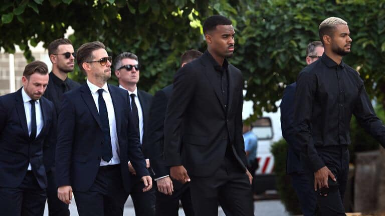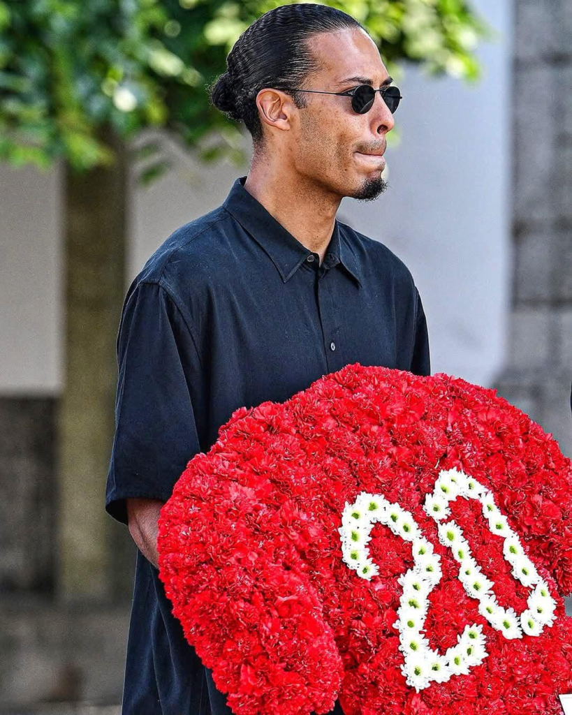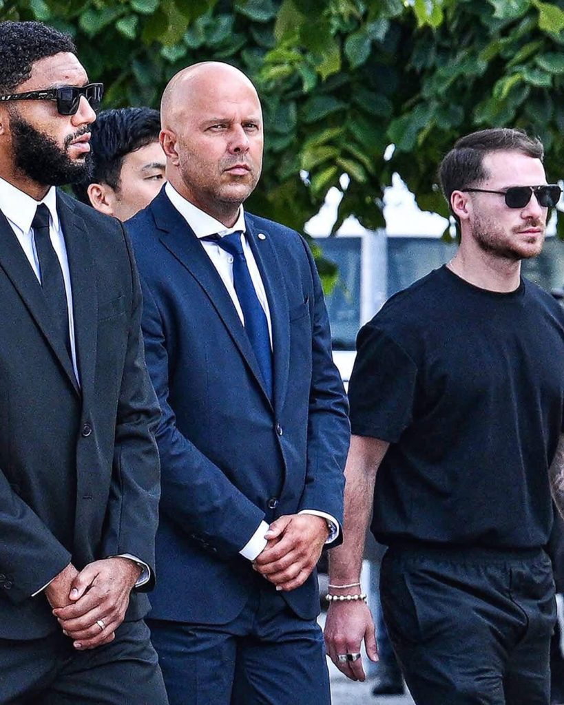 Kapiteni wa Liverpool, Virgil Van Dijk, umunyezamu Caoimhin Kelleher n’umutoza Arne Slot bari mu babanaga na Jota baje kumuherekeza we na murumuna we André Silva.