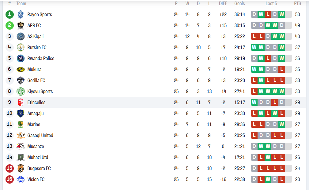 Kiyovu Sport yafashe umwanya wa munani n’amanota 30 nyuma yo gutsinda imikino 4 yose yikurikiranya ntanumwe itakaza, ibyo yabigezeho nyuma yo gutsinda Vision FC igitego 1-0 m’umukino wabaye kuri uyu wa gatanu wabimburiye imikino y’umunsi wa 25 wa shampion y’u Rwanda, ihita ishimangira ko itazamanuka mu cyiciro cya Kabiri.